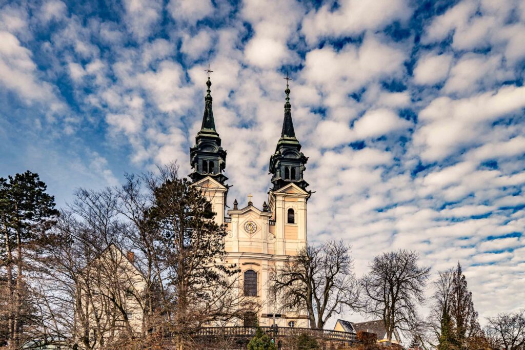Na szczycie wzgórza wita nas majestatyczna Bazylika Siedmiu Boleści Najświętszej Maryi Panny, barokowy kościół pielgrzymkowy górujący nad miastem. To prawdziwy symbol Linzu, widoczny z każdego punktu na dole.