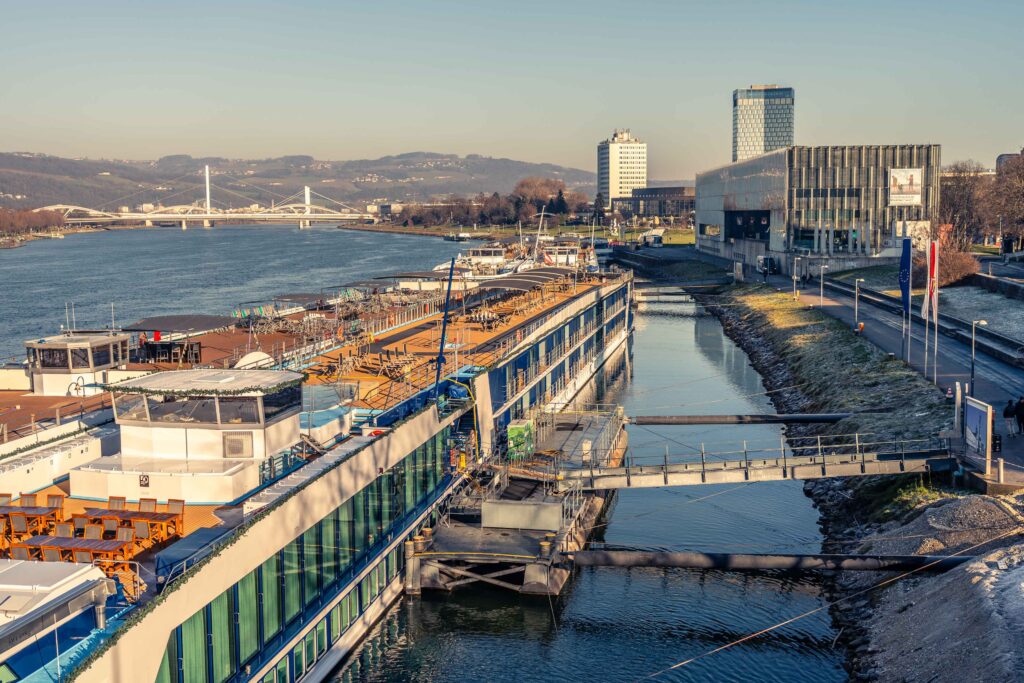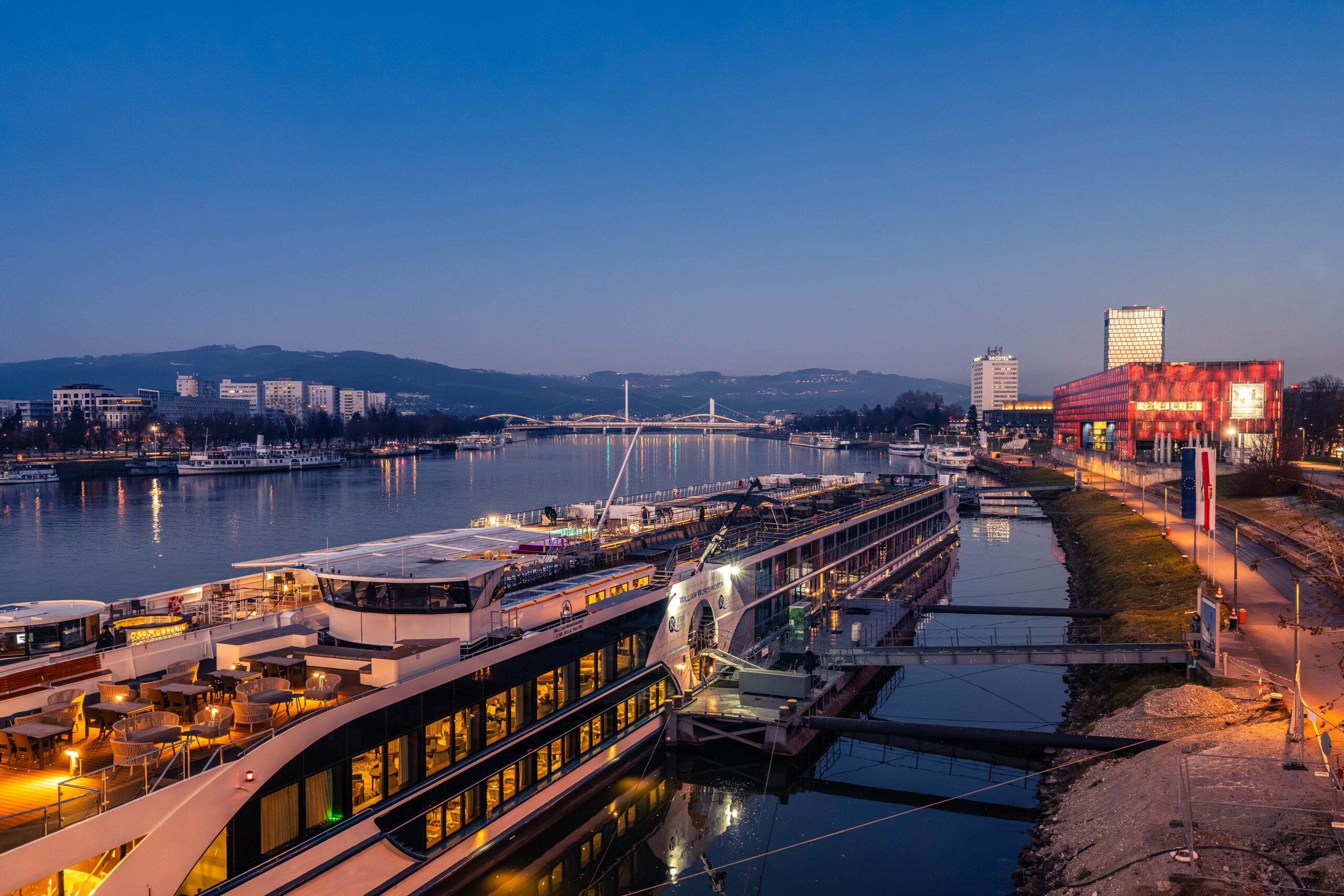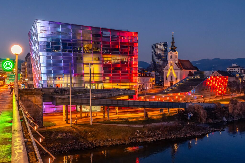 Tuż po drugiej stronie Dunaju wznosi się architektoniczna perła – Lentos Kunstmuseum. Budynek o szklanej fasadzie przyciąga wzrok zarówno w dzień, jak i w nocy (gdy rozświetla się na niebiesko, kontrastując z czerwoną barwą Ars Electronica).