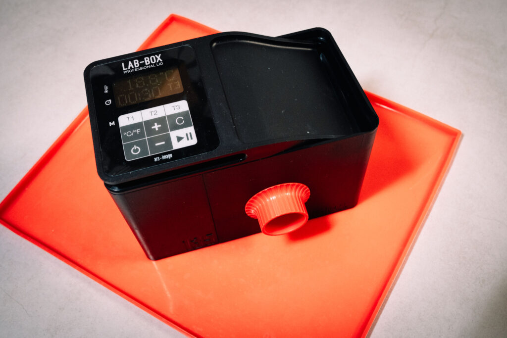 LAB-BOX ma modułową budowę, pozwala na „obsługę” filmów 35 i 120 mm, stosując różne przystawki. Umożliwia szybkie i sprawne nawinięcie filmu na szpulę, a następnie bezproblemowe przeprowadzenie całego procesu wywoływania. Jako osoba, która ma już jakieś doświadczenia z tym sprzętem – mogę szczerze polecić LAB-BOX – zamiast koreksu.